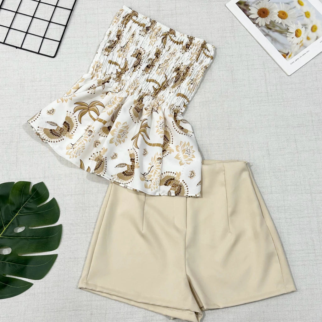 Descubra o charme e a leveza do Conjunto Feminino 2 Peças Femora, perfeito para dias quentes e cheios de estilo. Com design moderno e caimento impecável, este conjunto combina blusa estampada sem alças e shorts lisos, criando um visual casual, elegante e super confortável para o verão.